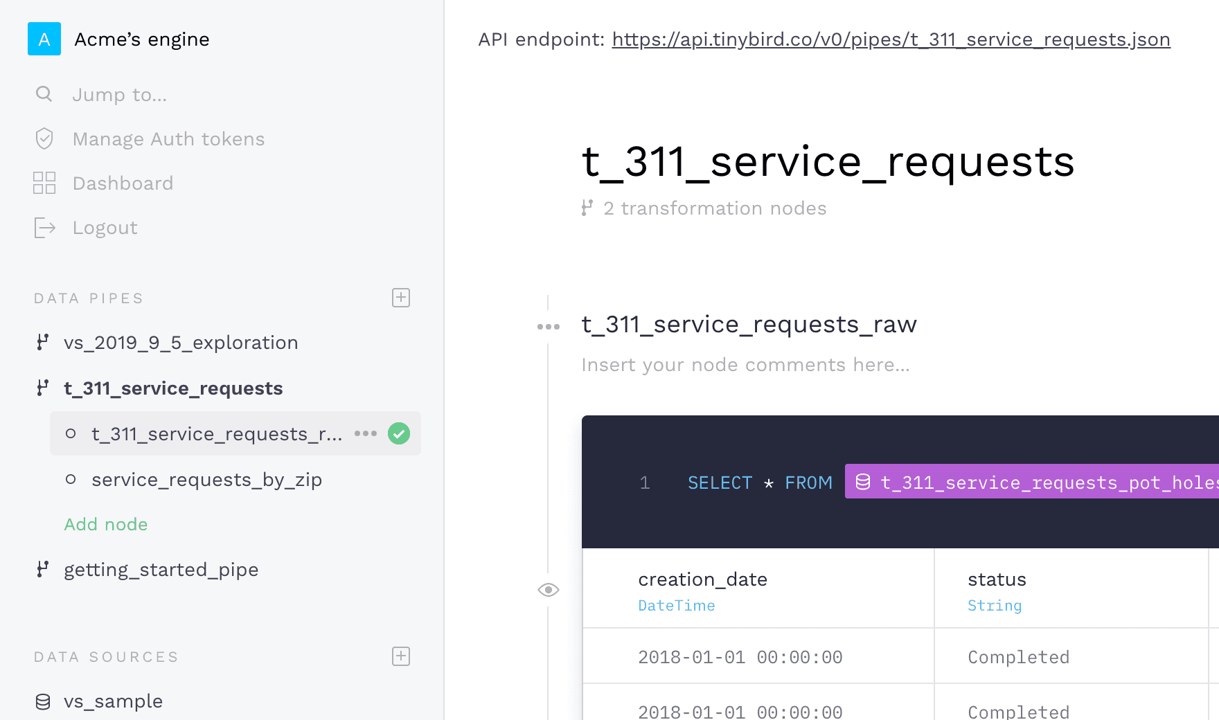 As a reminder, every Tinybird pipe is automatically a REST endpoint. I can query it directly like this: