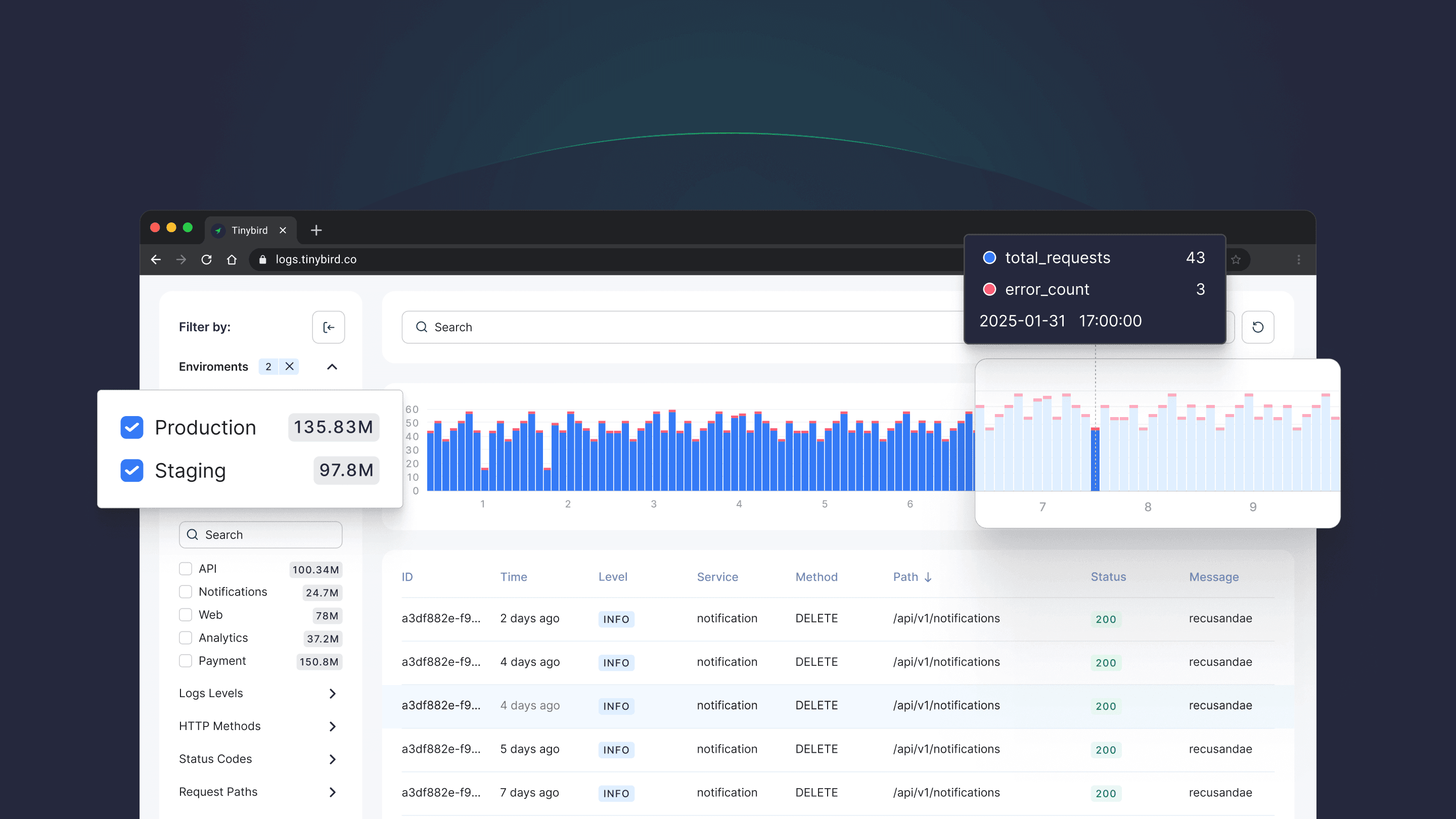 Today we're publicly announcing our open source Logs Explorer template, a free Next.js app + Tinybird backend that you can deploy for free in less than 5 minutes to use as a simple Datadog alternative or to build user-facing logs analytics features (like Vercel Observability or Supabase Query Logs) in your app or service.