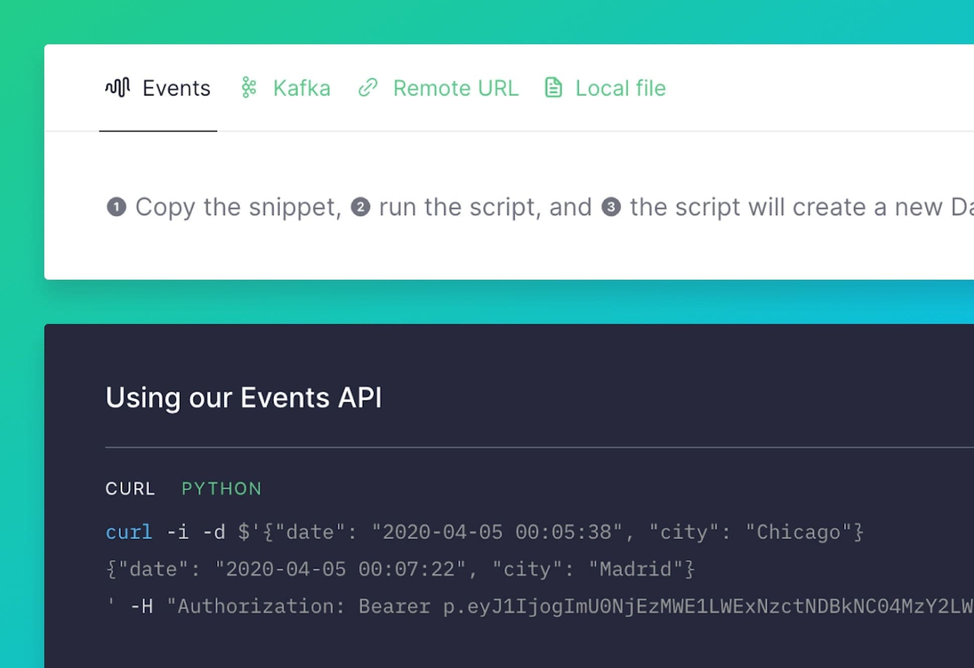 The Python backend implements all our public APIs, such as the Events, Pipes, and Tokens APIs; these APIs serve all the features to build data projects and provide access to users and metadata databases.